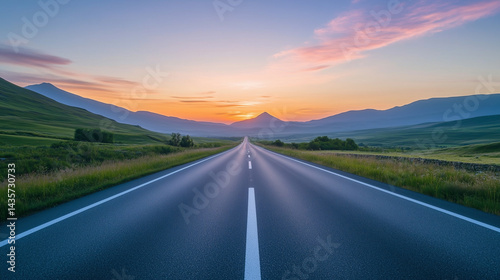 © Usaginikov, Naklejka premium Open Road Through Countryside Leading to Serene Sunset