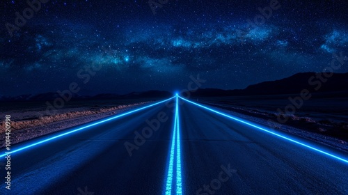 Fototapeta premium Open road under starry night sky with neon blue lines, futuristic travel concept