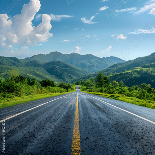 © MdAtiqur, Fototapeta premium Open Road Winding Through Green Mountains Sunny Day