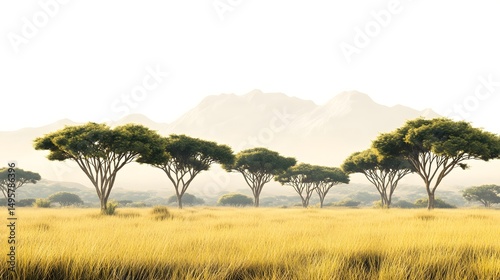 Naklejka premium Open savanna with acacia trees and distant mountains