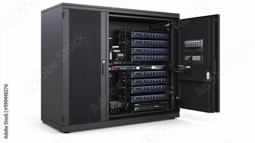Obraz premium Open server rack with network equipment and power supply units.