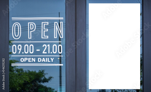 © Kunlathida, Obraz premium Open sign broad through the glass of door in cafe and copy space for text advertising
