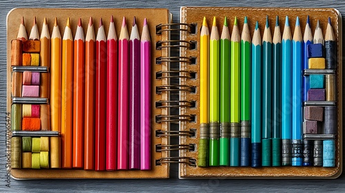 © Asad, Obraz premium Open sketchbook displaying a vibrant array of colored pencils arranged neatly