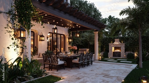 © TJAYZ, Obraz premium Open terrace with outdoor dining set under pergola, accented by lanterns and dusk lighting