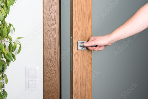 Fototapeta premium Open the door. A man's hand on the door handle. Dark wood and light interior.