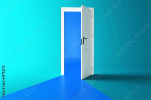 © adobedesigner, Naklejka premium Open the door. Symbol of new career, opportunities, business ventures and initiative. Business concept. 3d render, blue light inside open door isolated on turquoise background. Modern minimal concept.