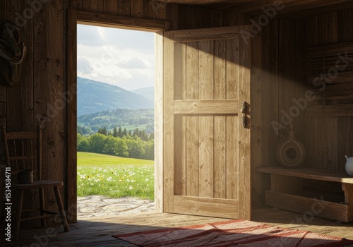 Obraz premium Open wooden door of a rustic cabin reveals a scenic mountain landscape