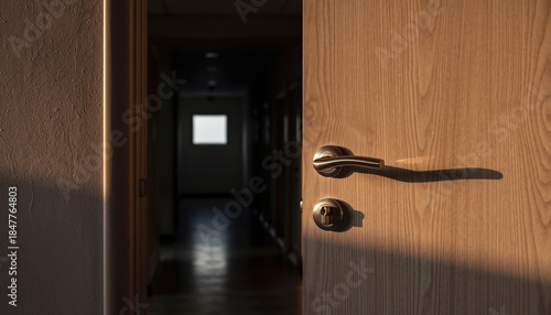© Arx PhotoStock, Obraz premium Open wooden doorway leading to dim hallway