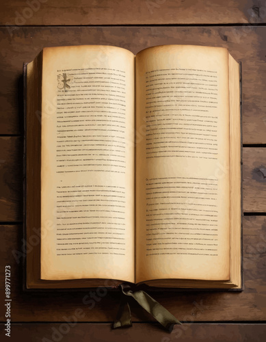 © NguyenThi, Fototapeta premium Opened Antique Book with Worn Pages and Torn Binding, Vintage Look