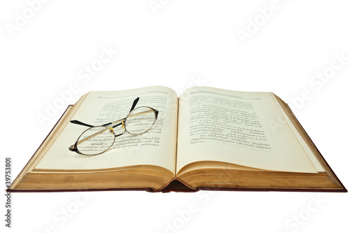 © PinkBlue, Obraz premium opened book with eye glasses isolated on white background