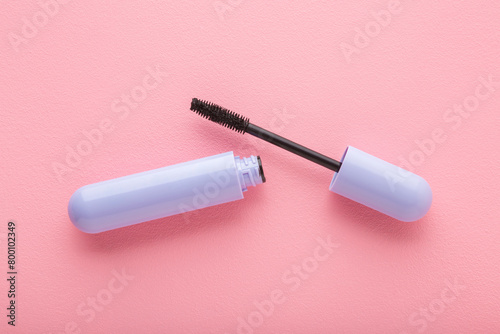 Fototapeta premium Opened purple tube of black eyes mascara on light pink table background. Pastel color. Female beauty product. Closeup. Top down view.
