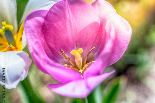 Naklejka premium opened tulip flower in green blurred image