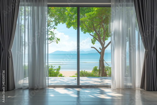 Fototapeta premium Opened window seeing tropical beach view in summer holiday at weekend house...
