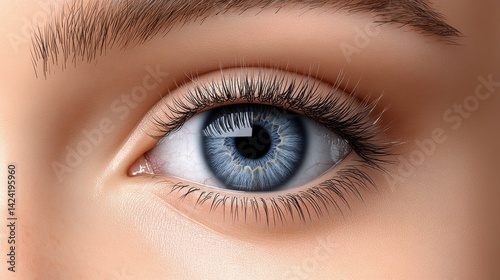 © Johannes, Obraz premium Opening and blinking female eye with a blue iris and long lashes painted with mascara. Gray eye close up of the iris and the pupil dilation and contracts. Eyeball, retina, eyelid. Slow motion.