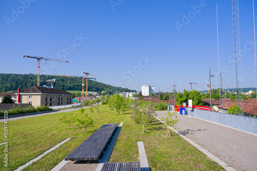 © Michael Derrer Fuchs, Naklejka premium Opening day of public park named Ueberlandpark at Swiss city of Zürich on a sunny spring morning. Photo taken May 10th, 2025, Zurich Schwamendigen, Switzerland.