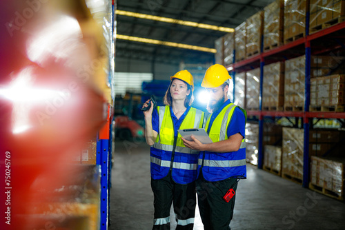 Obraz premium operation workers checking and inspecting cargo for stack items for shipping....