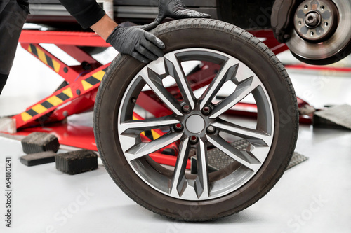 Fototapeta premium Operator in gloves supporting car with wheel in workshop