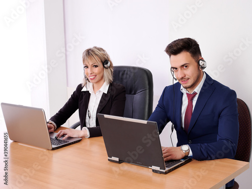© Julián Maldonado, Fototapeta premium Operators with positive aptitude answering customer calls