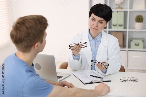 © New Africa, Obraz premium Ophthalmologist consulting young man at white table in clinic