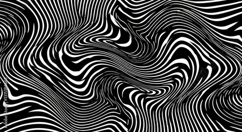 Naklejka premium Optical illusion, black and white swirling pattern, hypnotic spiral design, zebra-like stripes, abstract geometric art, psychedelic waves, trippy visual effect, monochrome vortex, Op Art style, dizzyi