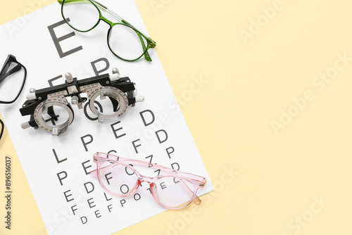 Fototapeta premium Optical trial frame with eye test chart and eyeglasses on pink background