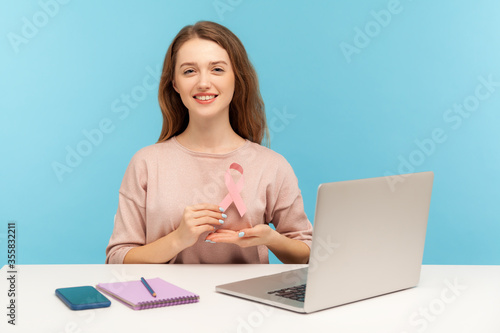 © khosrork, Naklejka premium Optimistic young woman, volunteer or manager, sitting at workplace with laptop and holding pink ribbon, symbol of breast cancer awareness, female health. indoor studio shot isolated on blue background