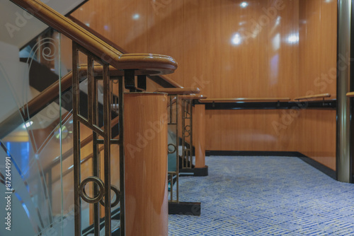 Naklejka premium Opulent Art Deco decor interior architecture inside lobby, atrium or foyer on ocean liner cruiseship cruise ship with staircase, corridors, carpets, chandeliers and art work