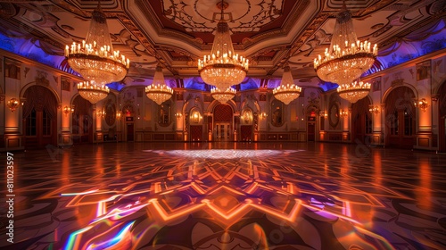 Obraz premium Opulent ballroom filled with radiant chandeliers, where the light creates a kaleidoscope effect on the intricately patterned floor, suitable for a highend event venue brochure or a