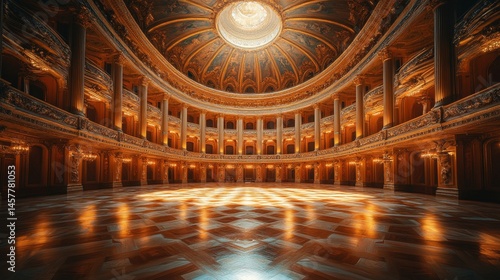 Obraz premium Opulent ballroom interior featuring gilded decorations and a magnificent domed ceiling with skylight