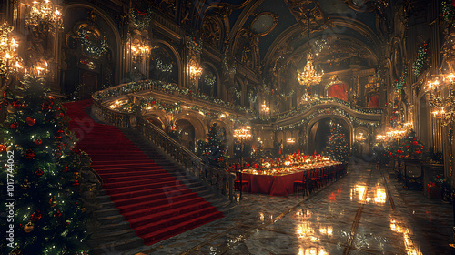 Obraz premium Opulent banquet hall adorned with Christmas decor, featuring grand chandelier, festive trees, and elegant staircase for holiday gatherings.