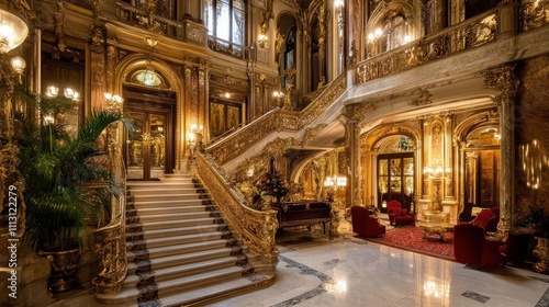 Obraz premium Opulent Baroque-style luxury hotel lobby, gilded details, grand staircase,...