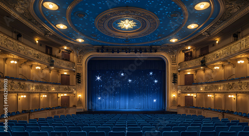 © abu, Obraz premium Opulent Blue and Gold Theater Interior Featuring Ornate Details Stage and Empty Seating with Dramatic Lighting