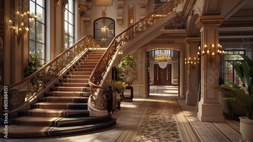 © Aeman, Fototapeta premium Opulent entrance with a grand staircase and a hand-woven silk runner