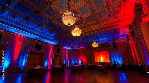 © ZUBI CREATIONS, Obraz premium Opulent Event Space with Bright Chandeliers, Detailed Ceiling, and Warm Lighting Enhanced by Red and Blue Accents