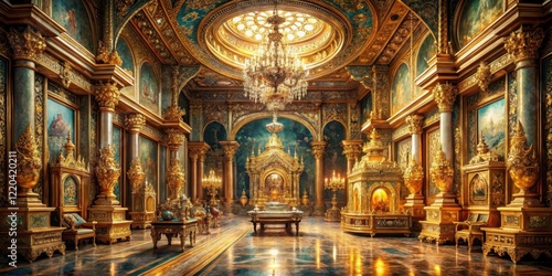 © Praphunsak, Obraz premium opulent gold chamber filled with glittering jewels and ancient relics amidst ornate tapestries, long corridors, jewels and gems