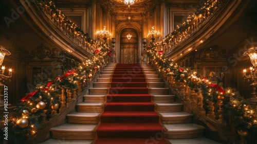 Obraz premium Opulent Grand Christmas Staircase with Elegant Holiday Decorations