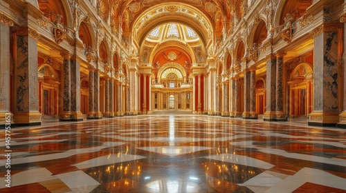Obraz premium Opulent hall bathed in golden light, showcasing classic architecture with a reflective marble floor.