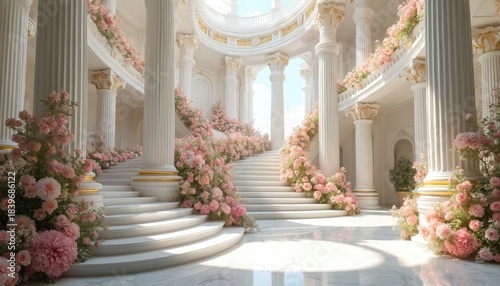 Naklejka premium Opulent marble staircase adorned with pink floral garlands. Classic palace...