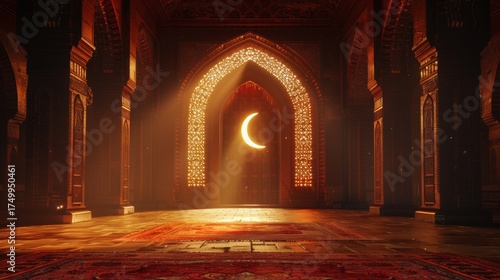 Obraz premium Opulent Mosque Interior Illuminated by Crescent Moon Symbolizing Hope and...