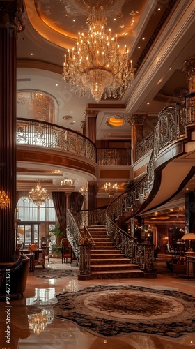 © Thawatchai, Obraz premium Opulent Neo Classical Hotel Lobby with Ornate Chandeliers and Spiral Staircase