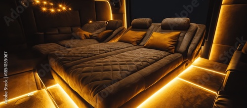 © Fana Art, Fototapeta premium Opulent Relaxation: Plush Quilted Loungers Bathed in Warm, Golden LED Light
