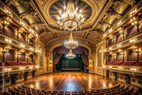 © Chanchai, Obraz premium Opulent theater hall with lit chandeliers and stage Aerial, magnificent, opulence, concert,theater hall, auditorium, rich, lights, ambiance, luxurious, architecture, chandeliers