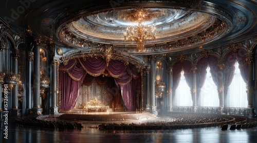 © TimelessClicks, Obraz premium Opulent Theater Interior with Stage, Chandelier, and Red Velvet Curtains