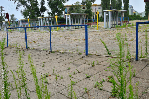 Fototapeta premium Opuszczony i zaniedbany dworzec autobusowy i puste przystanki.