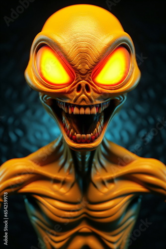 Fototapeta premium orange alien with glowing yellow eyes and scary teeth portrait photo