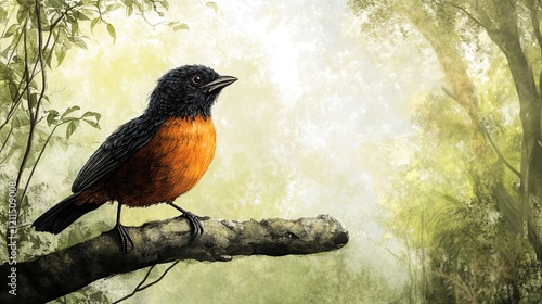 Fototapeta premium Orange and black bird perched on branch in forest.
