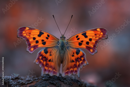 Obraz premium Orange and black butterfly with purple-tinted wings perched on textured surface