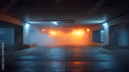 © W.O.W, Fototapeta premium Orange and blue lights illuminating an empty underground parking garage. Mysterious industrial concrete basement for film backdrops.