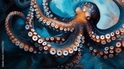 © Pure Imagination, Fototapeta premium Orange and Blue Octopus in Dark Underwater Setting