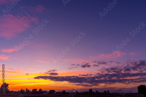 Fototapeta premium Orange and blue sky after sunset and silhouette of trees. Countryside of Thailand.